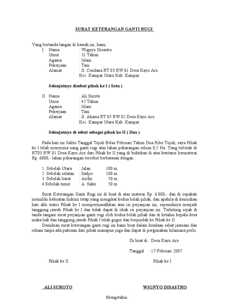 Informasi contoh surat pernyataan ganti rugi lahan.pdf Ada 7 halaman contoh surat pernyataan ganti rugi lahan ukuran Folio 1.7MB. Surat keterangan ganti rugi. surat pernyataan ganti rugi sebidang tanah. contoh surat pernyataan ganti rugi tanah contoh surat Baca juga contoh soal: ganti serta latihan materi contoh surat pernyataan ganti rugi lahan